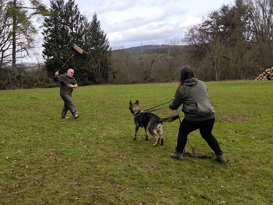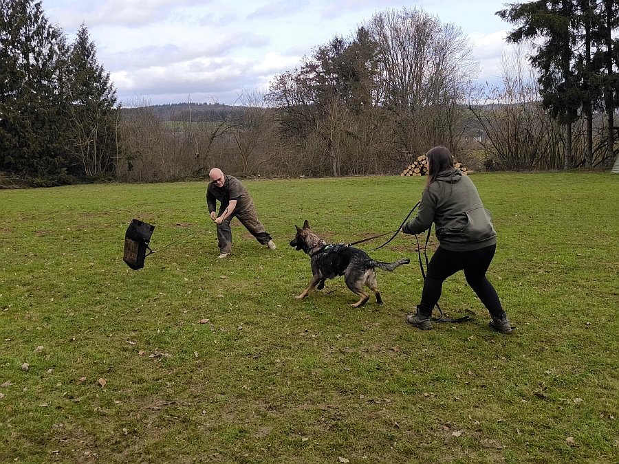 Dafür brachten die Teilnehmer geeignete Beutegegenstände mit, um grundlegende Abläufe nachvollziehbar aufzubauen. Gestartet wurde bewusst mit Trockenübungen ohne Hund. Hierfür wurden zweier Teams gebildet. Eine Person übernahm die Rolle des Helfers bzw. Beuteführers, die andere Person „spielte“ den Hund. So konnten sie zunächst optimal erarbeiten, wie die Beute geführt wird, was Bewegung signalisiert, in welchem Zustand der Hund arbeitet (aktiv oder passiv) und wie die Wechsel im Beutebereich technisch sauber aussehen.