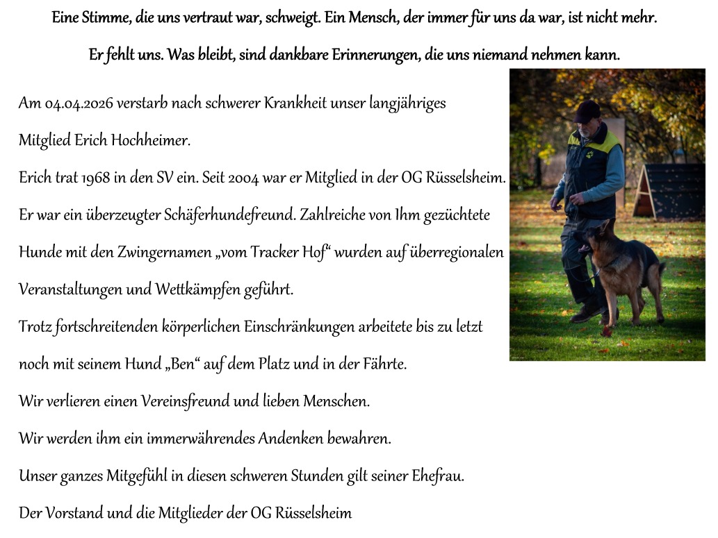 Wir, die OG Heusenstamm, bedanken uns für ihre geleiste Arbeit in der OG, sie war seit 2004 im Vorstand tätig. Danke! Elke-Lore bildete ihre Hunde alle selber aus, Sie war sehr aktiv.